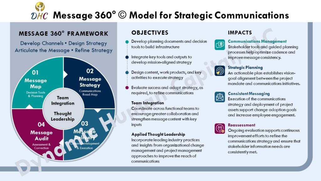We leverage related tools and best practices in strategic communications, organizational change management, and leadership engagement to navigate the various facets of change.
